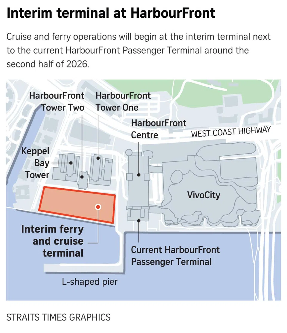 The move is part of the planned redevelopment of the 97,700 sqm HarbourFront Centre, which has hosted ferry and cruise operations since 1992. Provisional approval for redevelopment was granted by the Urban Redevelopment Authority (URA) in 2023, with plans to replace the centre with 101,326 sqm of office space and 42,000 sqm of retail space. However, it remains unclear whether a new ferry and cruise terminal will be included in the redeveloped site.