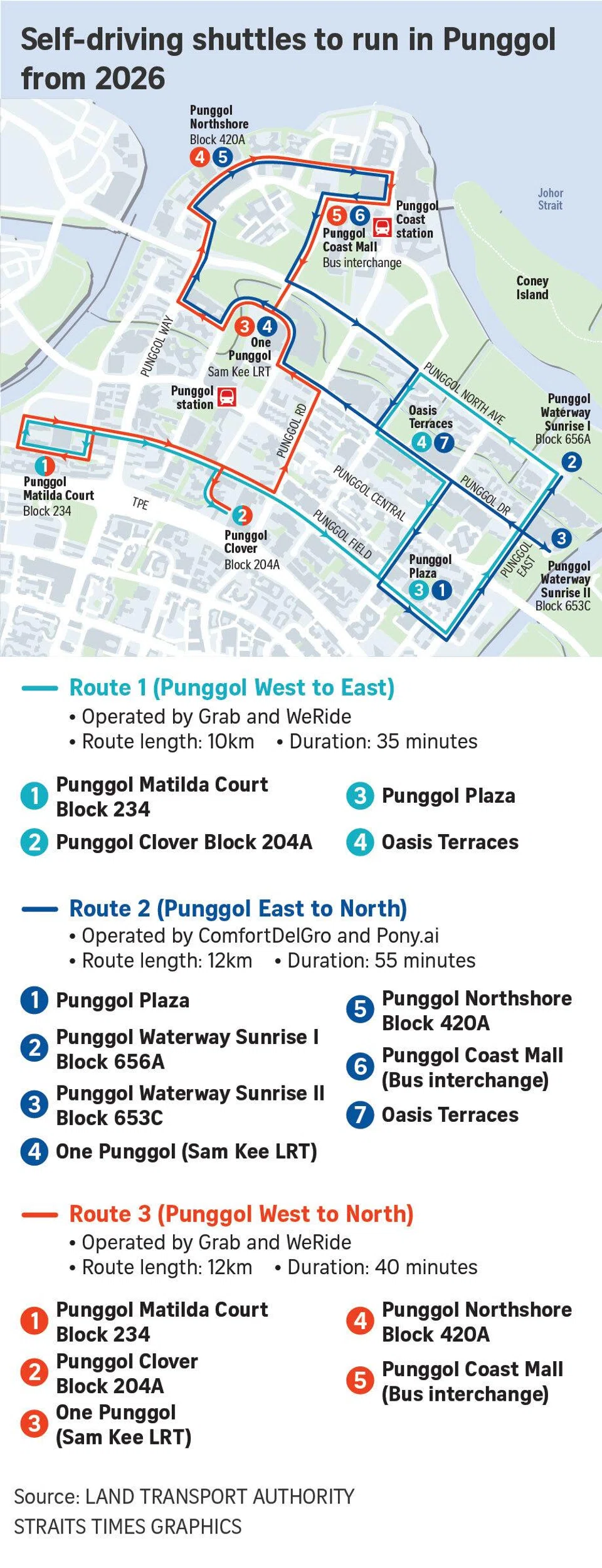 The deployment is part of a broader plan to roll out three autonomous shuttle routes across Punggol. Route 1 and Route 3 are operated by Grab, while Route 2 is managed by ComfortDelGro and remains in earlier preparation stages. Route 2 will serve north east Punggol, connecting Northshore residents to Oasis Terraces, Punggol Plaza, One Punggol, and Punggol Coast MRT station. All routes will operate on weekdays from 9:30am to 5pm, with shuttles arriving roughly every 15 minutes.